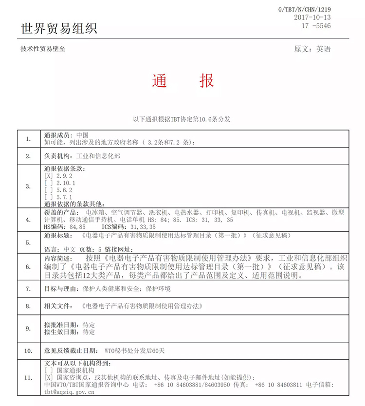 今年夏天在國內征求意見的中國RoHS第一批《達標管理目錄》與“應用例外情況”備受行業關注,2017年已經馬上過去了,不少電子、家電產品的生產企業都非常關心目前“達標管理目錄”的進展。 目前,中國RoHS第一批《達標管理目錄》與“應用例外情況”已經于2017年12月11日結束了在WTO上進行的TBT通報,已經進入了30天的評議期。 順利的話,預計中國RoHS第一批《達標管理目錄》會在2018年的春天發布。 正式發布以后會設置一定的過渡時間,給相關生產企業、制造商留出相應的時間調整。 下面的截圖為中國RoHS第一批《達標管理目錄》與“應用例外情況”的WTO/TBT通報 通報G/TBT/N/CHN/1219 《電器電子產品有害物質限制使用達標管理目錄(第一批)》(征求意見稿)