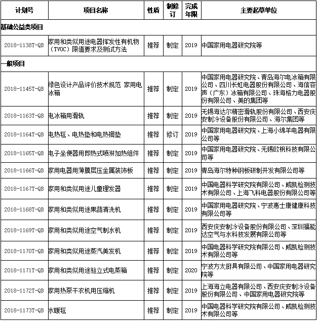 2018年5月11日,工業和信息化部辦公廳發布“關于印發2018年第二批行業標準制修訂和外文版項目計劃的通知”【工信廳科〔2018〕31號】。其中,全國家用電器標準化技術委員會歸口的標準計劃共計13項,具體項目如下: