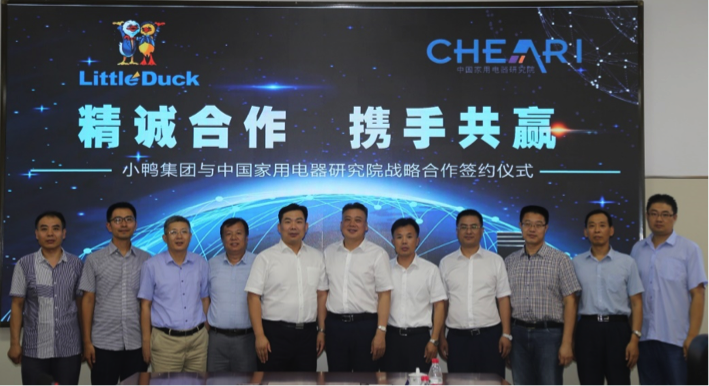通過會談雙方在共性技術研究與交流、研發成果評價與檢測、《家電科技》理事會成員等方面的合作取得共識,并達成戰略合作協議,魯建國所長與邢照斌總經理在劉挺院長、李永剛董事長見證下,簽署了中國家用電器研究院和山東小鴨集團戰略合作協議。