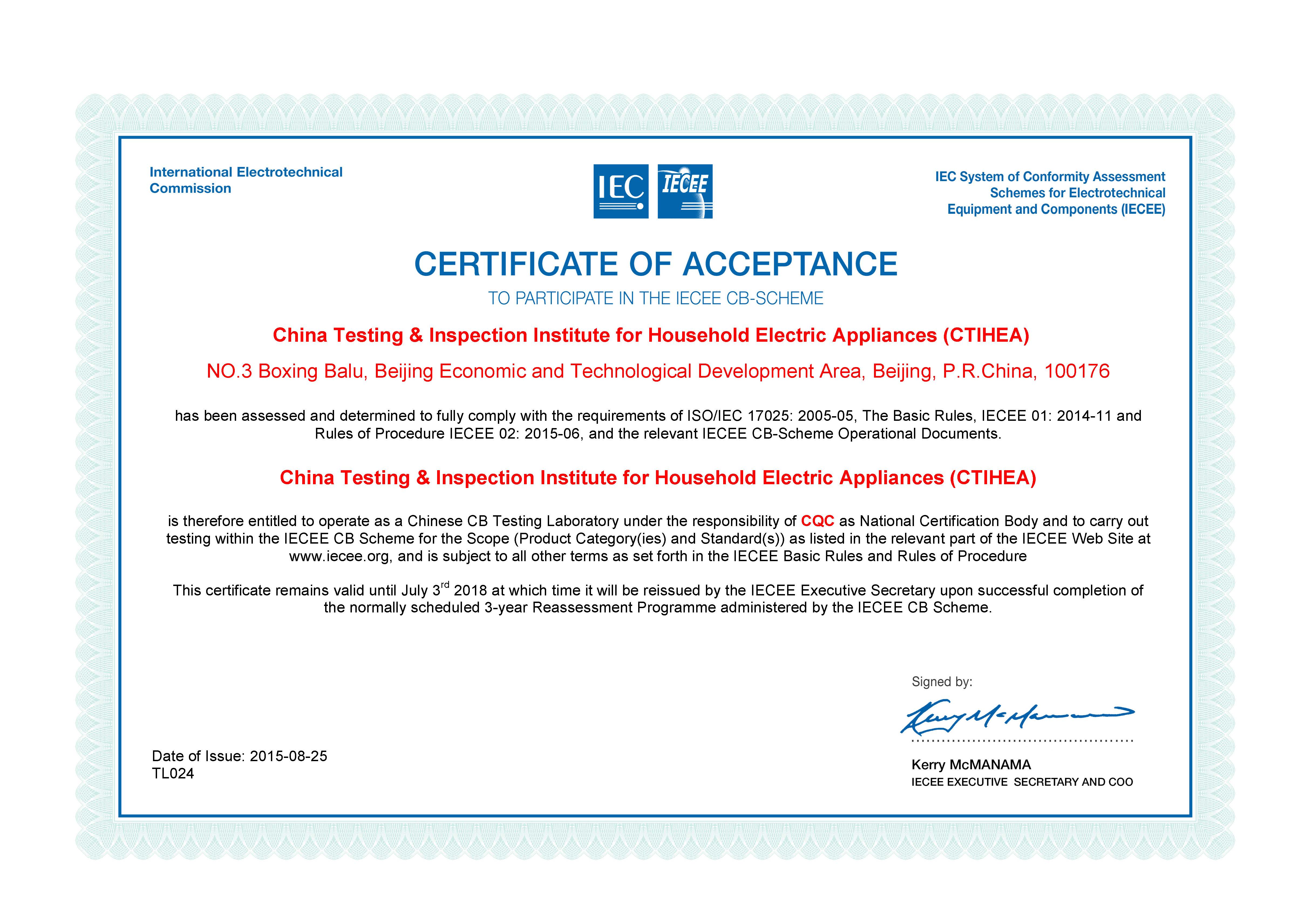 2018年8月21日至22日,受國際電工委員會電工產品合格測試與認證組織(IECEE)秘書處委托,CB評審專家組對中國家用電器研究院CB實驗室進行了審查。經過兩天的評審,我院順利通過并得到了國際專家的認可。