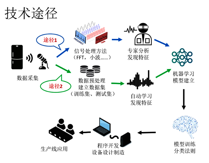 為了解決該問題,行業采用了各種措施。例如常見的:搭建在線靜音室,人工用耳朵來逐臺測聽甄別。該方法在環境比較安靜時很有效。因此得到了廣泛的應用,但是存在一些問題無法解決:(1)人工耳朵測聽沒有定量的標準,因人而異,無法形成統一的質量控制標準;(2)人耳測聽的結果無法進行數據傳輸,無法數據統計計算,測聽的結果價值大打折扣;(3)需要專業的人員來完成測聽,測聽結果會隨著人耳的疲勞偏移;(4)人員的成本很高。基于以上分析,尋找異音機器自動識別是迫切需要解決的行業共性問題。