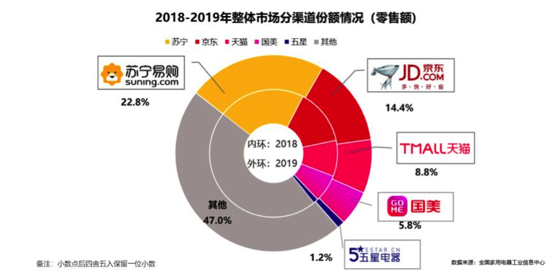 線上市場在中國消費市場中的重要性已經不言而喻,但線下市場在某些方面依然具有優勢,比如在高端產品上,在“以舊換新”實施過程中,線下賣場都具備線上市場所不具備的優勢,因此,線上和線下全渠道推進一直是家電企業和流通渠道推進的方向。線上平臺不斷向線下延伸自己的觸角,比如蘇寧易購依據線上線下全場景的運營,開展針對性強的銷售活動;京東與五星合作,開拓自己的旗艦店。從全渠道的銷售數據來看,正是得益于線上線下的協同發展,蘇寧易購在整個家電市場的份額達到了22.8%,京東由于線下實體店的規模要小很多,市場份額為14.4%(包含五星電器,合計規模為15.6%)。